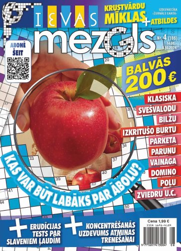 IEVAS MEZGLS. Mazformāta žurnāls ar vieglām mīklām intelektuālai izklaidei: zviedru mīklas, klasiskās, rēbusi, makaronu, japāņu, burtu-skaitļu, asociāciju, šifrētās, parketa, krustskaitļu, sudoku... Balvās 200 eiro katru mēnesi.
