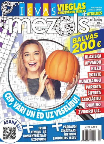 IEVAS MEZGLS. Mazformāta žurnāls ar vieglām mīklām intelektuālai izklaidei: zviedru mīklas, klasiskās, rēbusi, makaronu, japāņu, burtu-skaitļu, asociāciju, šifrētās, parketa, krustskaitļu, sudoku... Balvās 200 eiro katru mēnesi.