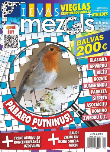 IEVAS MEZGLS. Mazformāta žurnāls ar vieglām mīklām intelektuālai izklaidei: zviedru mīklas, klasiskās, rēbusi, makaronu, japāņu, burtu-skaitļu, asociāciju, šifrētās, parketa, krustskaitļu, sudoku... Balvās 200 eiro katru mēnesi.