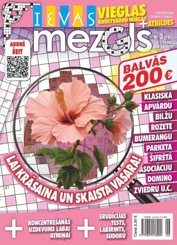 IEVAS MEZGLS. Mazformāta žurnāls ar vieglām mīklām intelektuālai izklaidei: zviedru mīklas, klasiskās, rēbusi, makaronu, japāņu, burtu-skaitļu, asociāciju, šifrētās, parketa, krustskaitļu, sudoku... Balvās 200 eiro katru mēnesi.