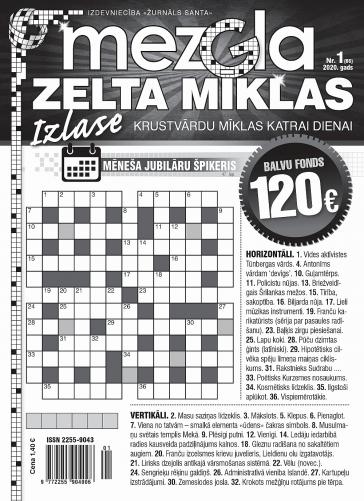 MEZGLA ZELTA MĪKLAS. Ikmēneša klasisko krustvārdu mīklu izdevums ar mīklām katrai mēneša dienai. Pievienotā vērtība – dienas kalendārā informācija, fakti, joki. Balvu fonds 120 eiro.