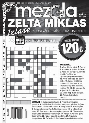 MEZGLA ZELTA MĪKLAS. Ikmēneša klasisko krustvārdu mīklu izdevums ar mīklām katrai mēneša dienai. Pievienotā vērtība – dienas kalendārā informācija, fakti, joki. Balvu fonds 120 eiro.