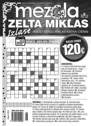 MEZGLA ZELTA MĪKLAS. Ikmēneša klasisko krustvārdu mīklu izdevums ar mīklām katrai mēneša dienai. Pievienotā vērtība – dienas kalendārā informācija, fakti, joki. Balvu fonds 120 eiro.