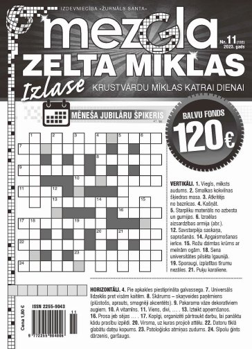 MEZGLA ZELTA MĪKLAS. Ikmēneša klasisko krustvārdu mīklu izdevums ar mīklām katrai mēneša dienai. Pievienotā vērtība – dienas kalendārā informācija, fakti, joki. Balvu fonds 120 eiro.