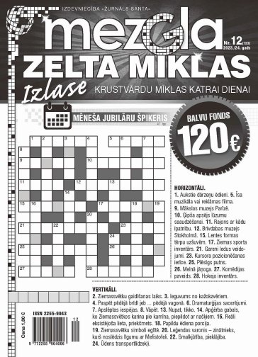 MEZGLA ZELTA MĪKLAS. Ikmēneša klasisko krustvārdu mīklu izdevums ar mīklām katrai mēneša dienai. Pievienotā vērtība – dienas kalendārā informācija, fakti, joki. Balvu fonds 120 eiro.