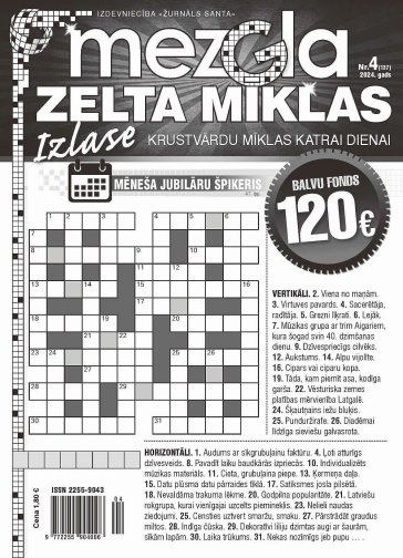 MEZGLA ZELTA MĪKLAS. Ikmēneša klasisko krustvārdu mīklu izdevums ar mīklām katrai mēneša dienai. Pievienotā vērtība – dienas kalendārā informācija, fakti, joki. Balvu fonds 120 eiro.