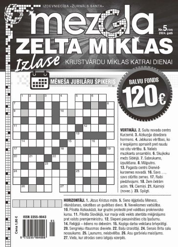 MEZGLA ZELTA MĪKLAS. Ikmēneša klasisko krustvārdu mīklu izdevums ar mīklām katrai mēneša dienai. Pievienotā vērtība – dienas kalendārā informācija, fakti, joki. Balvu fonds 120 eiro.