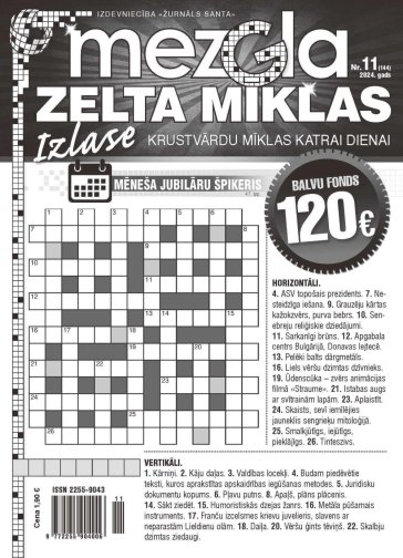 MEZGLA ZELTA MĪKLAS. Ikmēneša klasisko krustvārdu mīklu izdevums ar mīklām katrai mēneša dienai. Pievienotā vērtība – dienas kalendārā informācija, fakti, joki. Balvu fonds 120 eiro.